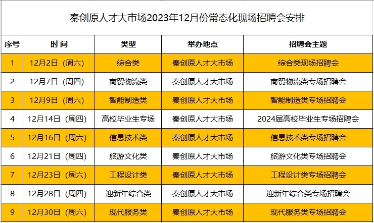 为产业发展聚人才,为人才求职搭平台,暖冬送岗 “职”在西咸,12月,秦创原人才大市场将举办9场不同主题类型现场招聘会满足各企事业单位和广大求职者双选需求,具体安排如下。
