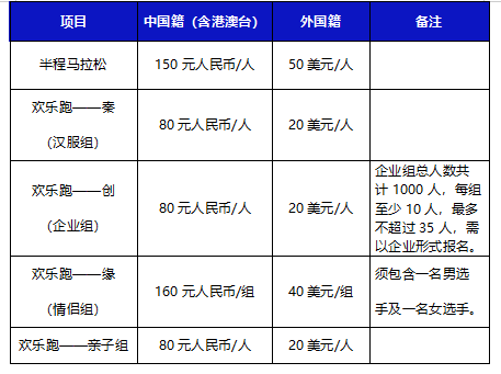 1.半程马拉松项目限报6000人,欢乐跑-秦(汉服组)限报1000人,欢乐跑-创(企业组)限报1000人、欢乐跑-缘(情侣组)限报500组、欢乐跑亲子组限报1000人。除企业组各项目报名人数超过限报名额后,参赛资格获取将采取抽签+候补退出机制的办法。