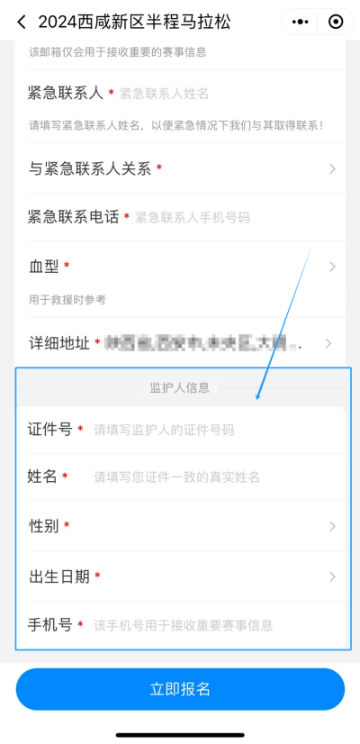 (3)与孩子(12周岁以上,18周岁以下)一起报名欢乐跑项目的家长在报名时,需要先完成自己的预报名。在为孩子报名时,须按要求填写监护人信息,如家长没有先于孩子完成报名,则孩子的报名信息将无法提交。