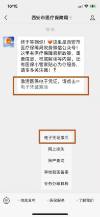 微信搜索“西安市医疗保障局”公众号并关注,可根据欢迎语提示激活,也可点击底部菜单栏激活: