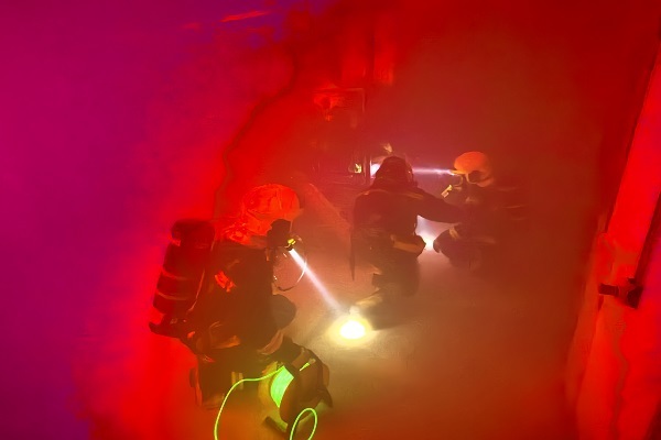 训练中,参训队员在黑暗、浓烟、狭小密闭空间内,依靠自身所掌握的技能与知识,逐步推进、互相配合,采用低姿或匍匐方式通过训练室烟道内上下挡板及障碍物,在黑暗环境中寻找出口。训练紧贴灭火救援实际要求,真实还原火灾情况下的黑暗浓烟场景,充分锻炼了参训队员在浓烟、黑暗等复杂环境下的心理承受能力,提升了参训队员的识险、避险、处险能力。