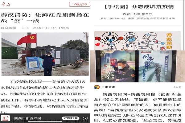 战“疫”一线故事暖人心。西咸消防多个“战“疫”一线故事在人民日报、西部网、陕西都市快报、陕西新闻网、西安发布、网易新闻、搜狐网、三秦网等多家媒体刊发,奋战一线的“火焰蓝”用奔赴一线的实际行动和并肩作战的“爱”谱写着一个个暖心又感动的抗“疫”故事。中国应急管理报专栏报道《“疫”不容辞 “防”不容缓 陕西西咸消防开展集中消杀》,陕西日报、群众新闻4次报道《让鲜红党旗飘扬在战“疫”一线》主题文章,西部法制报、华商报刊发长文《陕西西咸抗疫小分队“发挥职能优势,助力打赢疫情阻击战”》与《“火焰蓝”变“大白”24小时待命驻守,还为群众买菜送药》,西咸消防用一次次义无反顾的逆行出征,全力彰显“火焰蓝”的为民担当。