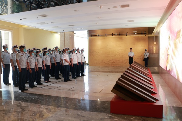 “为了谁?依靠谁?我是谁?”走进大厅,醒目的“领袖三问”迎面而来,警示每一个党员任何时候、任何地方,都不能忘记自己的初心使命。随后,全体人员跟随讲解员的脚步,沿着省、心、律、诫、儆、光、率、进、诺九大宣传板块,通过观看3D视频、音频介绍、图片资料、文字说明、实物展示等方式,一路走、一路看、一路思考……在展厅最后章节“诺”处,带着自己最衷心的回答,全体人员对镜整冠正衣,重温入党誓词,做出庄严承诺。