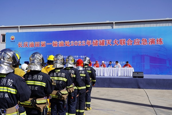 演练假设长庆石油商业储备库4号油罐装置因操作失误,导致原油储罐起火,火势迅速扩大蔓延。火灾发生后,长庆石油商业储备库消防控制室第一时间得到火情反馈,立即启动自动消防设施,并及时拨打119报警,同时启动应急预案,组织技术人员采取工艺流程措施对该灌区进行关阀和倒罐进行处理,现场岗位操作人员迅速启动固定消防设施开启喷淋对罐体进行冷却,利用消火栓、灭火器对泄漏燃烧点进行灭火处理,对着火装置区域进行警戒、隔离,疏散无关人员。兰池二路消防救援站接到报警后,迅速调集力量赶赴救援现场。
