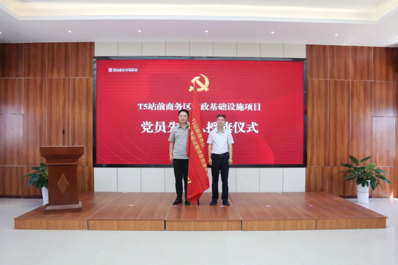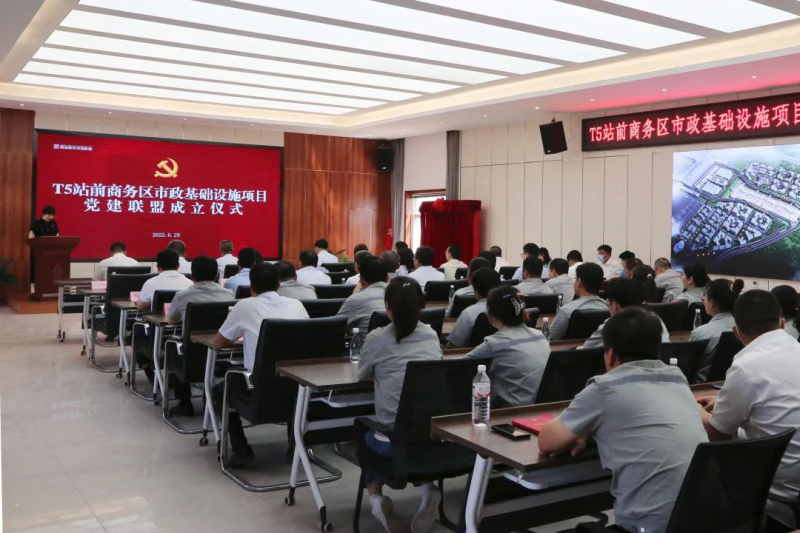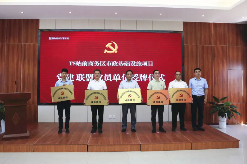 T5站前商务区是陕西、大西安对外开放的空中新门户和新窗口。当前,西安咸阳国际机场三期扩建工程建设正酣,T5站前商务区市政基础设施项目是为三期扩建工程中T5航站楼提供配套服务、为T5站前商务区发展提供基础保障的关键性市政建设项目,也是全省、全市、新区、新城四级重点工程。为广泛凝聚T5站前商务区市政项目各参建单位合力,以围绕项目抓党建,抓好党建促发展为目标,将党建与项目建设高度融合、一体推进,把党建优势转化为推进项目高质量建设的强大红色动力,空港新城T5站前管办党支部发起成立T5站前商务区市政基础设施项目党建联盟。