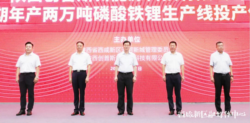 在创普斯新能源一期年产2万吨磷酸铁锂生产线投产仪式上,姜建春、张宏伟、陕西创普斯新能源科技有限公司董事长秦敬轩共同启动生产线。