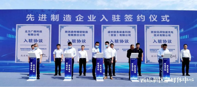 活动现场,北方广微非制冷红外探测器产业化项目、鼎奇精密制造总部基地、盛世防务精密零部件加工制造总部基地、迅湃科技动力电池检测设备生产线4个项目正式签约入驻西咸新区沣东新城信息产业园物流园区。