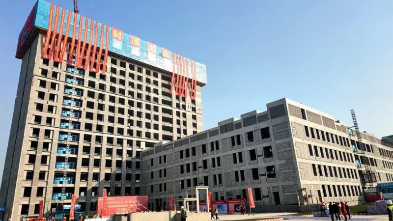 “三大中心”,整体计划于2024年完成建设。此次封顶的一期项目涵盖综合实验楼、科研办公楼、医技楼、门诊楼等配套建筑,计划开设床位500张。