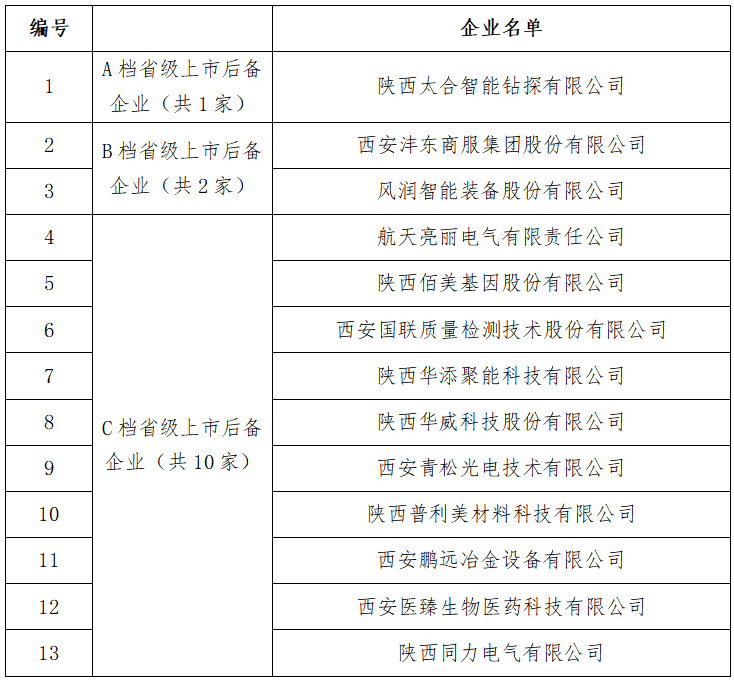 2023年陕西省上市后备企业名单(沣东新城入选13家企业)