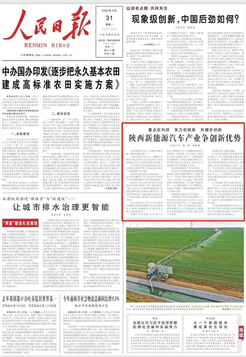 3月31日,《人民日报》头版刊发报道《重点在科技 发力在链条 关键在创新,陕西新能源汽车产业争创新优势》,关注西咸新区作为西北首个全域开放智能驾驶商业化的区域,在智能网联汽车领域的创新发展情况。部分内容节选如下: