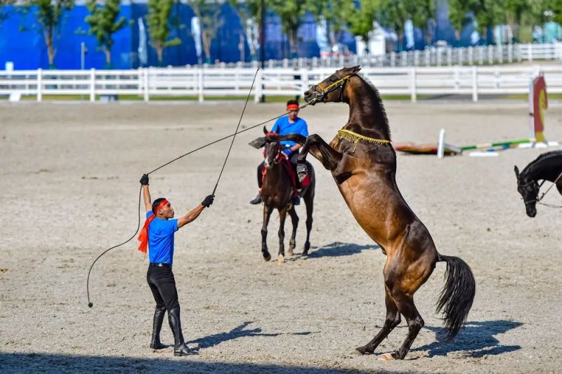 六匹健硕骏马有的前蹄抬起稳步直立前行,有的飞驰奔跃腾空如履平地,观众席上惊叹声此起彼伏……这是记者日前在第十四届全运会马术比赛场地——陕西西咸新区秦汉国际马术中心看到的场景。