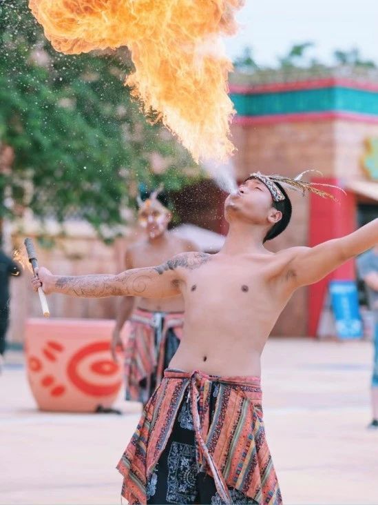穿特色服饰的舞者超有氛围感,喷火特技随手一拍都是大片,夜晚看更震撼。