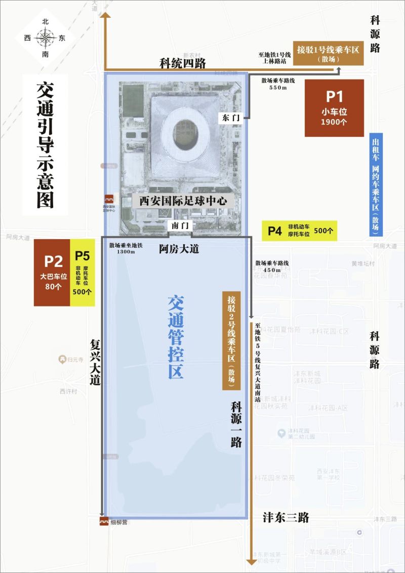 赛事期间足球中心周边车流量大,市民请尽量错峰出行,提前规划时间和路线;高峰时段避免进入管控路段,可绕行三桥新街、天台路、沣东大道、沣柳路等外围道路。