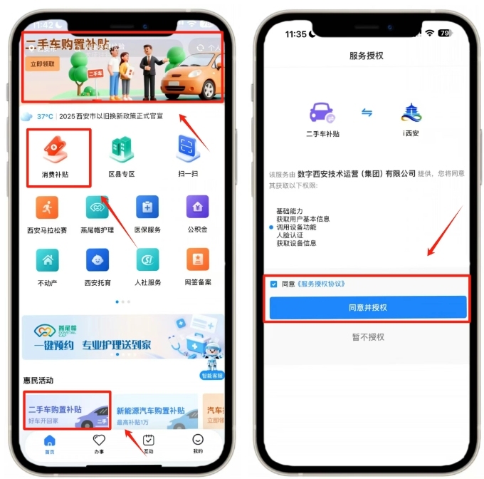 在【首页】点击轮播图【二手车购置补贴】或下方图标,点击【同意并授权】进入活动页面。