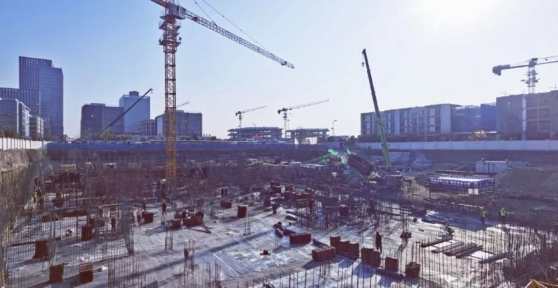 人勤春来早,建设正当时。铂樾万境中心(北区)项目施工现场,大型机械来回吊装材料,近百名工人正在负二层开展施工作业。