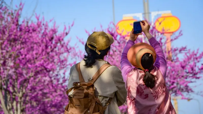 春分刚过,秦汉新城兰池二路已染成一片紫红,枝头紫荆花挤挤挨挨,远望如云霞铺展,这片花海就在西咸新区秦汉中学校门外,与琅琅书声相伴,绘出熙春画卷。