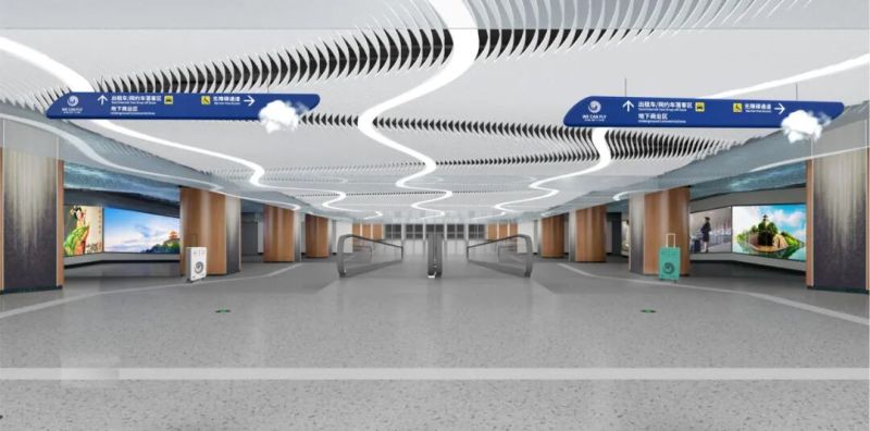 设计中巧妙融入飞机舷窗、机身、尾翼、云朵及旅客行李箱等航空代表性元素,深度融合智能标识理念,通过“化繁为简”的设计手法,打造出指引立牌、指引吊牌、创意果皮箱、云朵装置座椅四大类共三种风格的标识体系,既传递出“在空港,每一次出发都是梦想启航”的品牌温度,更实现了创意构想与区域整体环境的无缝融合。