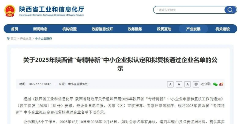 据了解,陕西省专精特新中小企业是指经省工业和信息化厅认定,专注于细分市场、掌握关键核心技术、创新能力强、市场占有率高、质量效益优,在专业化、精细化、特色化、新颖化等方面表现突出的中小企业。