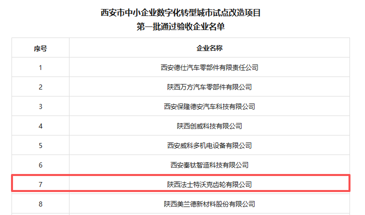 近日,西安市工信局公布了西安市中小企业数字化转型城市试点改造项目第一批通过验收企业名单,泾河新城入区企业陕西法士特沃克齿轮有限公司生产质量数字化改造项目顺利通过验收,成为新城制造业数字化转型的标杆示范。