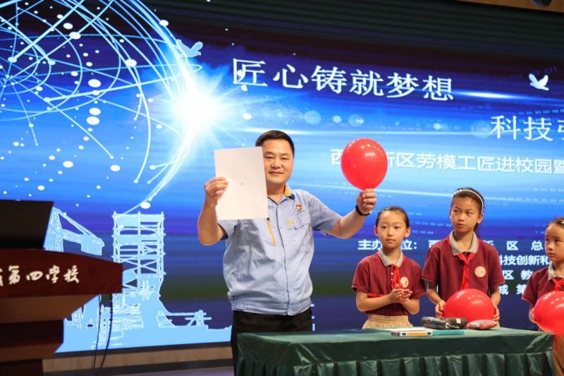 劳模精神的传递不仅在企业,也在校园当中。5月22日上午,新区总工会联合新区科技创新和新经济局、新区教育体育局在沣西新城第四学校举办“劳模工匠进校园暨科技活动周”活动,五百多名师生与大国工匠和全国五一劳动奖章获得者进行了互动。