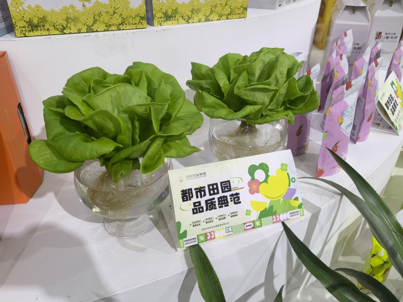 在展区的另一侧,水里生长的蔬菜同样吸引了不少市民。这是西安沣东现代都市农业示范园培育的水培奶油生菜,可以生食,口感脆嫩爽口、特别鲜嫩。