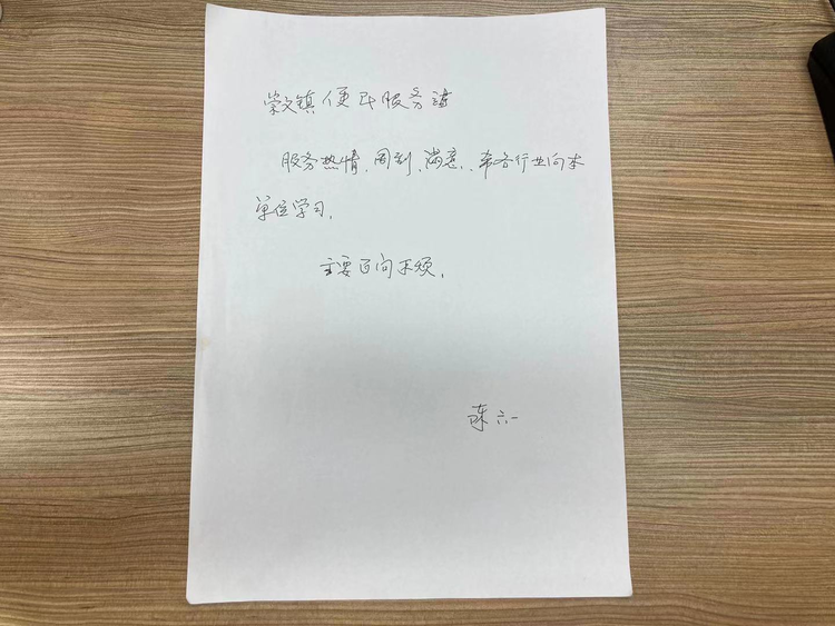 整个服务过程虽然双方沟通花费了较长时间,但最终为群众圆满解决了问题,工作人员的认真、耐心、细心、热心、热情周到的服务,得到了群众的不断感谢和称赞,群众主动提出要给工作人员写感谢信,因此,便有了下面这封由陈先生纯手写的感谢信。这封特殊的感谢信,话语寥寥,言辞真挚,体现了崇文镇便民服务站全体工作人员用心用情用力为人民服务的热忱,这更坚定了服务站工作人员尽心竭力为群众服务的信心和决心,在以后的工作中,崇文镇便民服务站全体工作人员将继续怀揣为民服务的初心和使命,为每一位办事群众提供最贴心最热情的服务,让他们高兴而来满意而归!