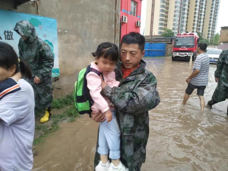沣东新城上林街道某幼儿园大量积水,导致周边区域出行不便。西咸消防闻令而动,迅速驰援。救援人员到场后对校园附近道路积水、淤泥进行清除,为师生家长及周边群众开辟出一条安全通道。在被困人员中,一名小女孩神情恐慌,害怕积水弄湿衣物。救援人员迅速将小女孩抱到安全地带,与她聊天安抚情绪,小女孩满眼崇拜,依靠在消防员怀里。