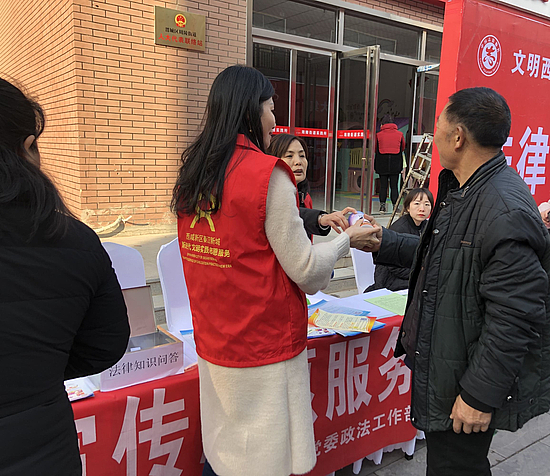 为深入贯彻党的十九大精神,推进新城新时代文明实践志愿服务再上新台阶,2019年12月5日秦汉新城党委政法工作部应新城文明办相邀,参加周陵街办周礼佳苑开展的“国际志愿者”文明实践活动,党委政法工作部司法科现场开展文明实践法治宣传活动。