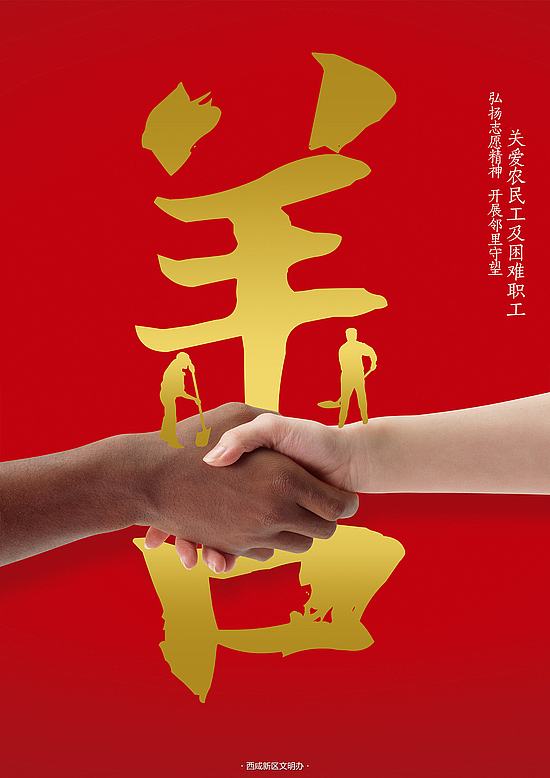 作品(系列)以爱、巢、善、家等字与手势虚实呼应,传达邻里守望、传递友爱、援手互助、邻里一家、关爱困难职工等价值。