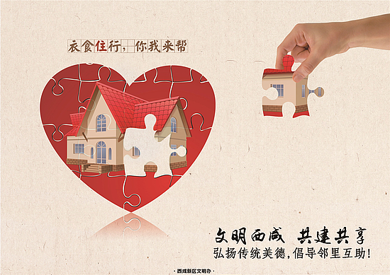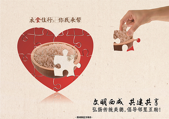 作品(系列)以“邻里互助”为创意点,将其放在拼接的“心”里面,寓意大家共同献出自己的爱心,帮助困难群众,互帮互助,共建文明和谐社区。