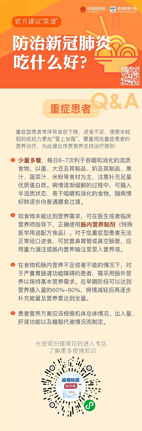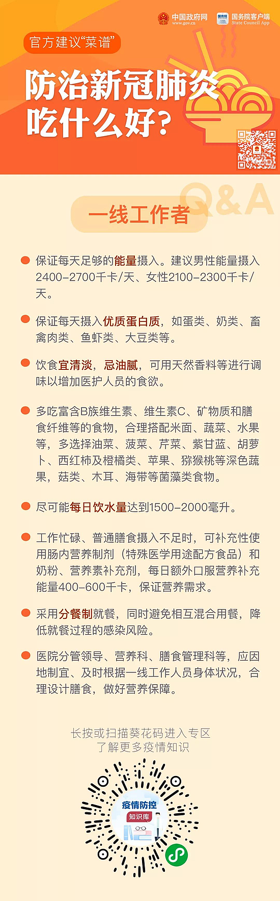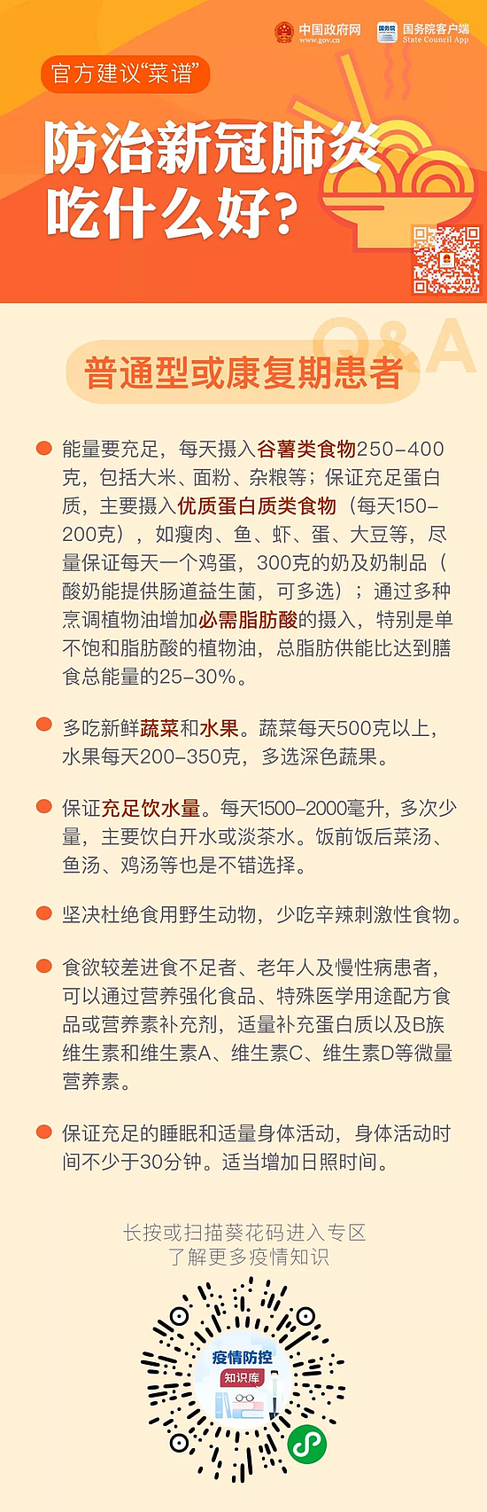 科学合理的营养膳食能有效改善营养状况、增强抵抗力,有助于新型冠状病毒肺炎防控与救治。国家卫健委日前发布《新型冠状病毒感染的肺炎防治营养膳食指导》。为方便大家查看,我们按照群体分类做成了图解,可以收藏下来或者转发给需要的人~我们一起营养膳食,抗击病毒!