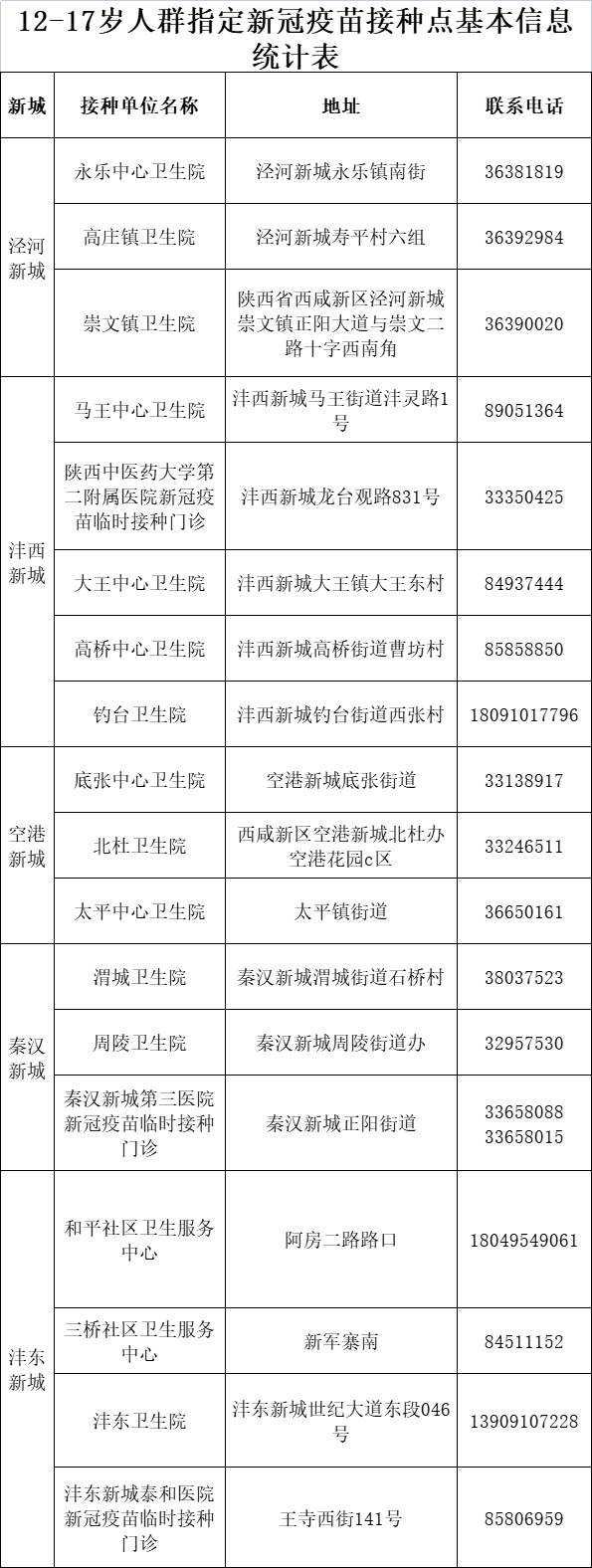 西咸新区未成年人新冠疫苗接种指定门诊有以下18家: