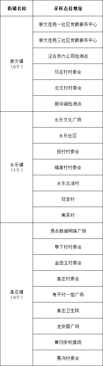 核酸检测采样点及具体时间安排以各街道办事处、社区(村)、单位通知为准,根据检测需求可能进行调整,请居民群众留意街道、社区(村)通知,或拨打新区咨询服务电话了解最新采样点信息。具体地点详见后附表格。
