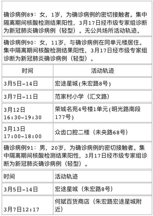 3月17日0-24时,我市新增4例本土确诊病例(均为轻型),均在集中隔离发现。现将主要活动轨迹公布如下(未公布的时间段尚未发现有公共场所活动轨迹):