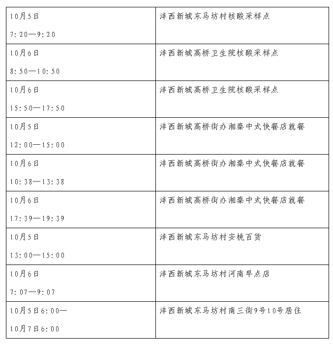 1名新冠肺炎确诊病例曾于10月5日6:00至10月7日6:00在沣西新城东马坊村核酸采样点、高桥卫生院核酸采样点、高桥街办湘秦中式快餐店、东马坊村安桃百货、东马坊村河南早点店、东马坊村南三街9号10号等6处点位有活动轨迹,请有以下轨迹交集的人员立即主动向属地疫情防控部门、社区(村)或单位报告,停止外出活动,在原地(或居家)等候,严格做好个人防护,并配合落实相关管控措施。