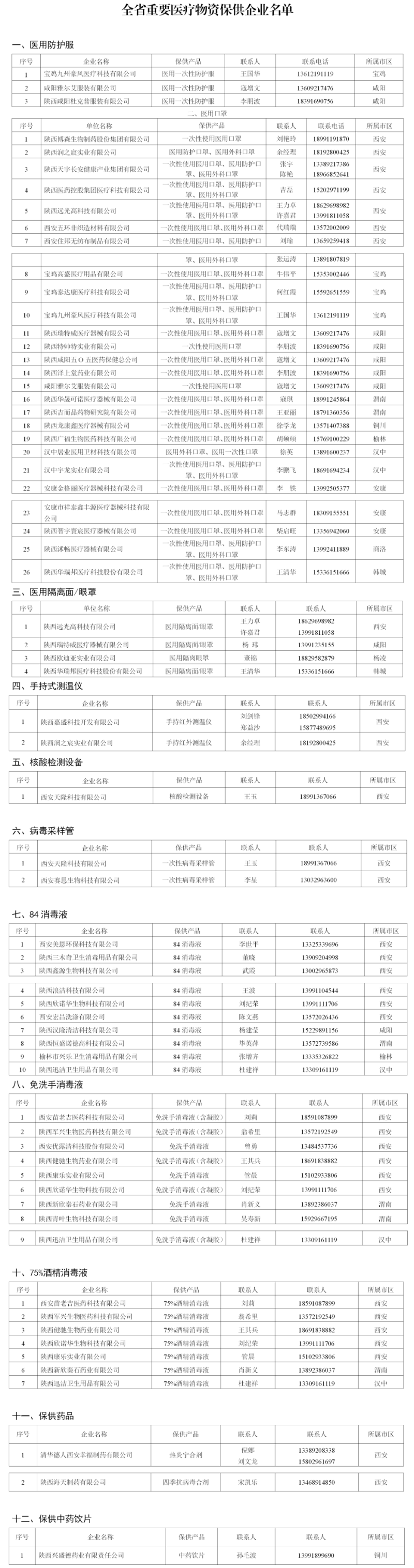 根据全省疫情防控形势需要,为建立生产企业与社会需求精准对接渠道促进全省疫情防控相关医疗物资有效供给,12月14日,陕西省工业和信息化厅发布第一批全省疫情防控医疗物资保供企业(生产企业)名单。
