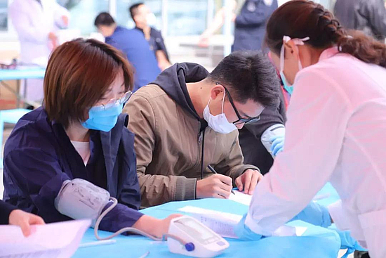 志愿者们从工作岗位上匆匆赶来,虽然因连日坚守岗位而略带倦意,但他们却毫不犹豫地撸起袖子,积极献血。