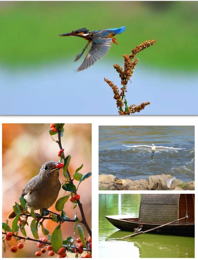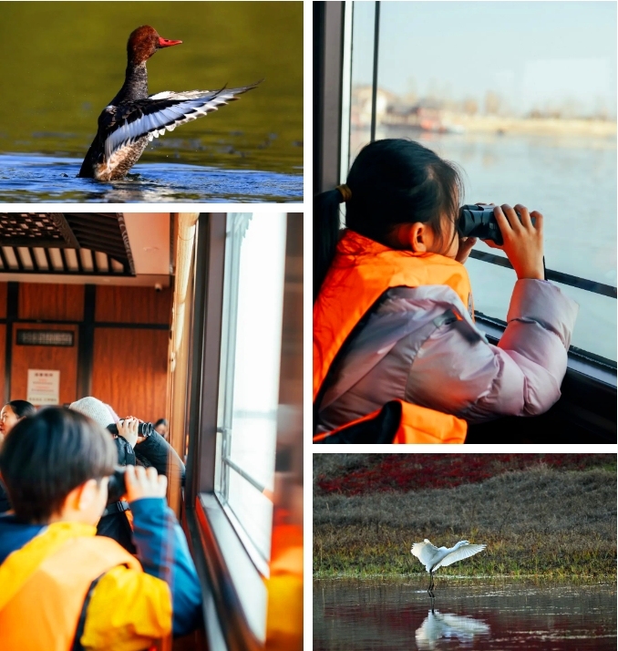 除了岸上观鸟,乘坐画舫更能和鸟儿们来一场“亲密接触”。搭乘游船湖面观景的同时,带上望远镜就能清晰捕捉到鸟儿的细微特征,无论是五彩斑斓的羽毛色彩,还是灵动活泼的姿态,甚至鸟儿捕食的瞬间,或是它们梳理羽毛时的憨厚可掬,都能一览无余。