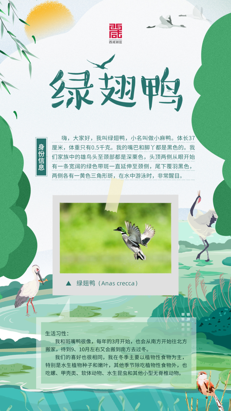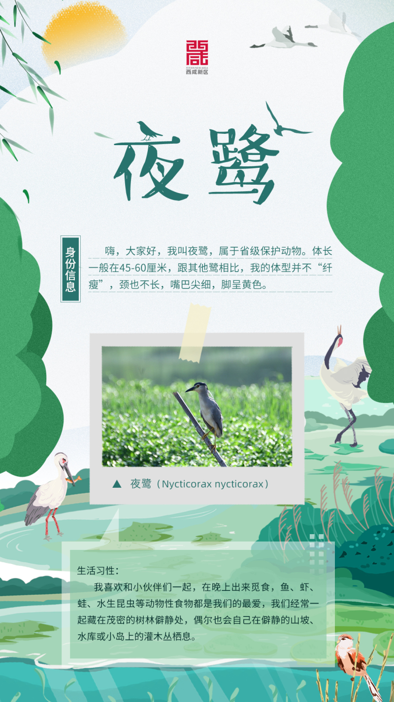 优美的旋律,诗意的歌词勾勒出蓝天净土、河清水绿的生态画卷。近年来,随着生态环境的改善,西咸新区的魅力里多了一抹“绿”的风采。人、城、景、动物,在这里呈现出一派生态祥和的美好画面。“绿色”、“自然”,正成为西咸新区的一张新名片。今天,是第50个世界环境日,结合“人与自然和谐共生”的活动主题,小编整理了白鹭、夜鹭、池鹭等10种在新区常见的“鸟类”伙伴,介绍给大家认识,一起来看看吧: