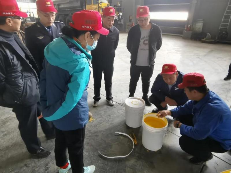 企业工作人员现场演示工程机械的喷涂用料调制工艺,表示企业喷涂用料为环保水性漆,并且达到环保标准。