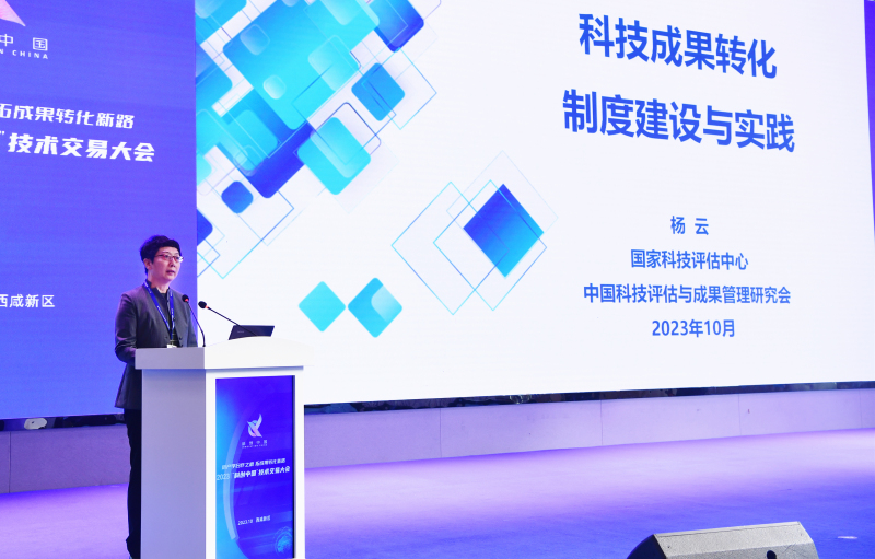 在主论坛环节,国家科技评估中心副总评估师、中国科技评估与成果管理研究会秘书长杨云以《科技成果转化制度建设与实践》作主旨报告。