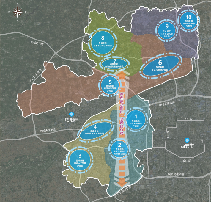 “10园区”统一采用“西咸新区+布局新城+园区核心产业”的园区命名方式,分别是:西咸新区·沣东先进制造产业园、西咸新区·沣东统筹科技资源改革示范园、西咸新区·沣西人工智能产业园、西咸新区·沣西数字经济产业园、西咸新区·秦汉自动驾驶产业园、西咸新区·秦汉大健康产业园、西咸新区·空港自贸蓝湾产业园、西咸新区·空港临空经济产业园、西咸新区·泾河双碳光伏产业园、西咸新区·泾河两链融合示范园。