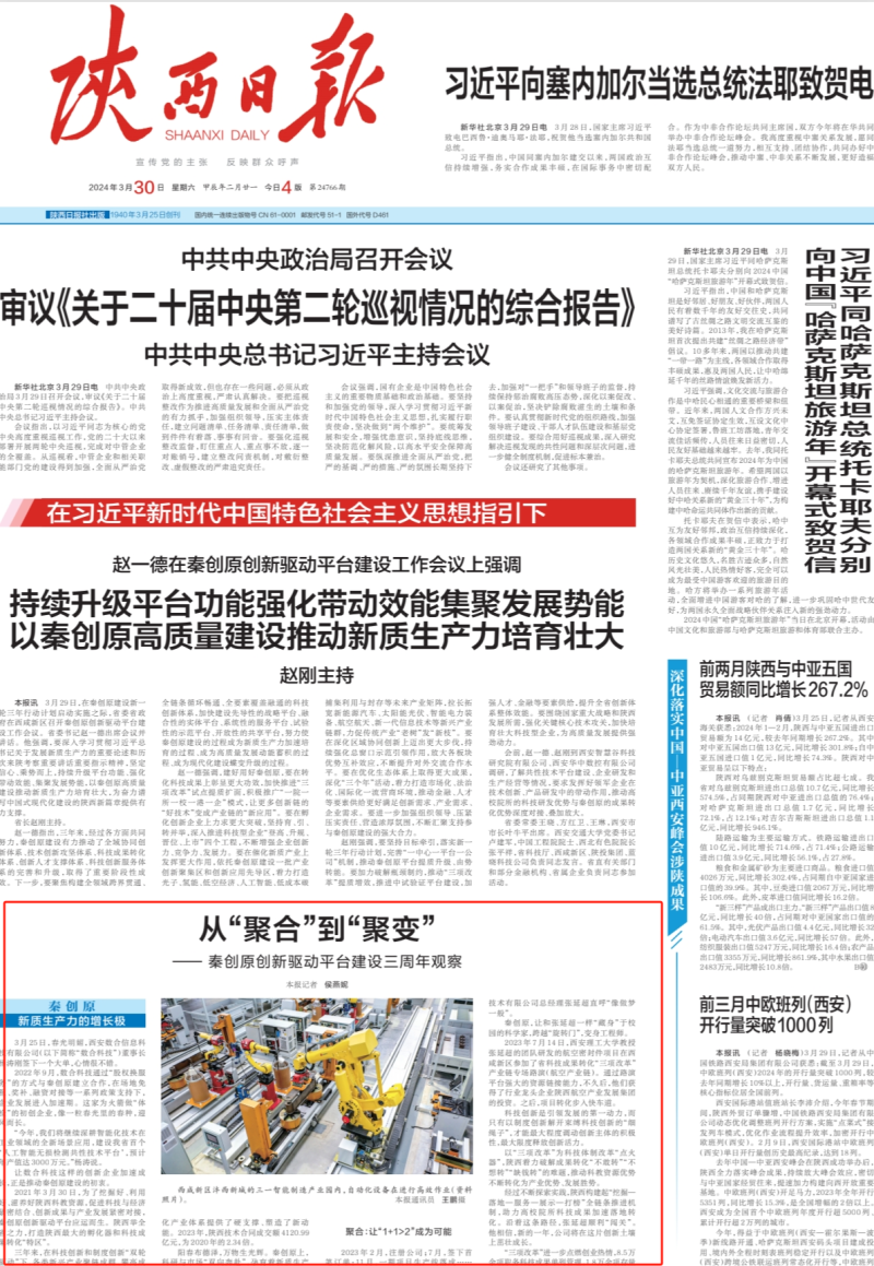 今天,《陕西日报》头版刊发《从“聚合”到“聚变”——秦创原创新驱动平台建设三周年观察》,报道陕西加速推进秦创原建设各项工作取得显著成效,重点关注西咸新区作为秦创原总窗口通过科技创新和制度创新推动各类新兴产业聚链成群、攀高成势,全文如下。