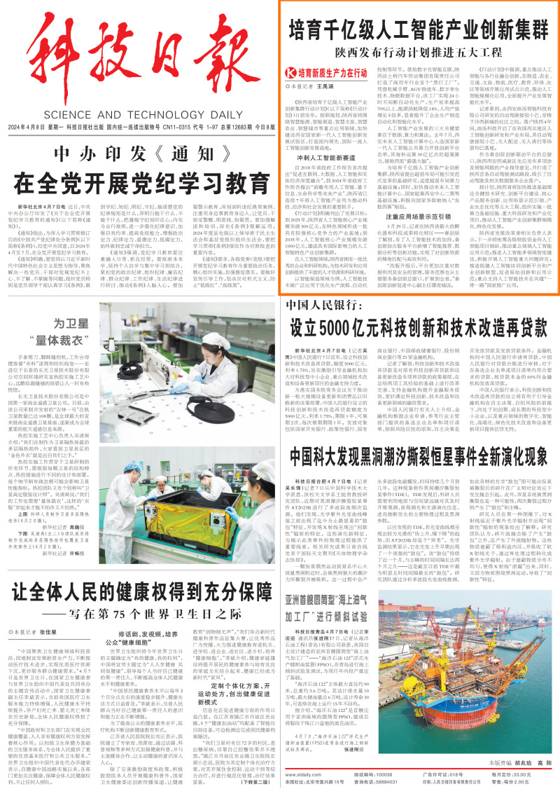 4月8日,《科技日报》头版刊发《培育千亿级人工智能产业创新集群》报道西咸新区发挥秦创原总窗口作用,在人工智能技术的加持下未来产业加速壮大,节选如下。