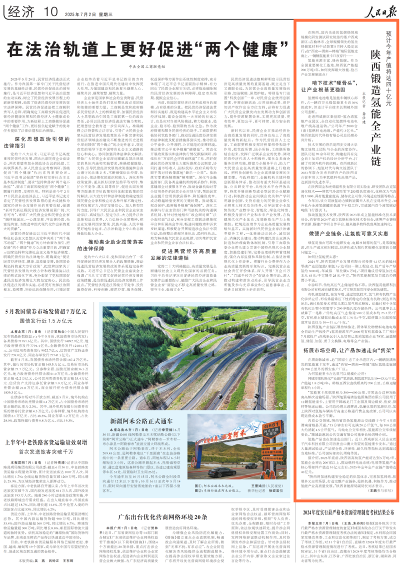 人民日报刊发报道《陕西锻造氢能全产业链预计今年产值将达四十亿元》