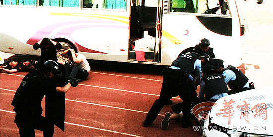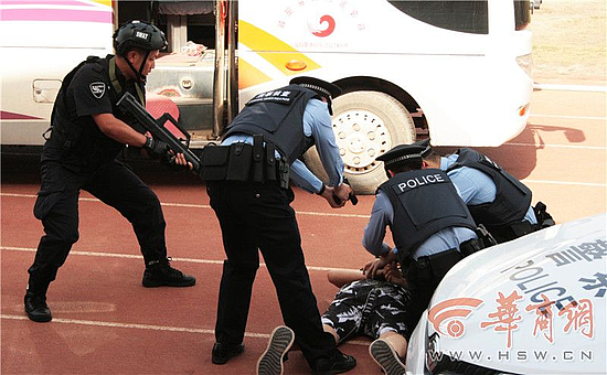 烈日下,数名“歹徒”劫持“人质”驾车飞奔。被警方围追堵截后,歹徒嚣张地要求放行,但还没等拿人质说事,一名试图引爆炸弹的歹徒即被狙击手撂倒,一只警犬跃起两米多高扑入车内……短短几分钟,人质被成功解救。雷霆般的处置演练,赢得了现场群众的一片喝彩。