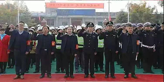 誓师大会上,公安干警为群众展示擒拿操练,刘功毅带领公安及司法综治队伍、网格员、安全员进行宣誓,参加活动的领导在背景墙幕上签名,演员为群众表演文艺节目。