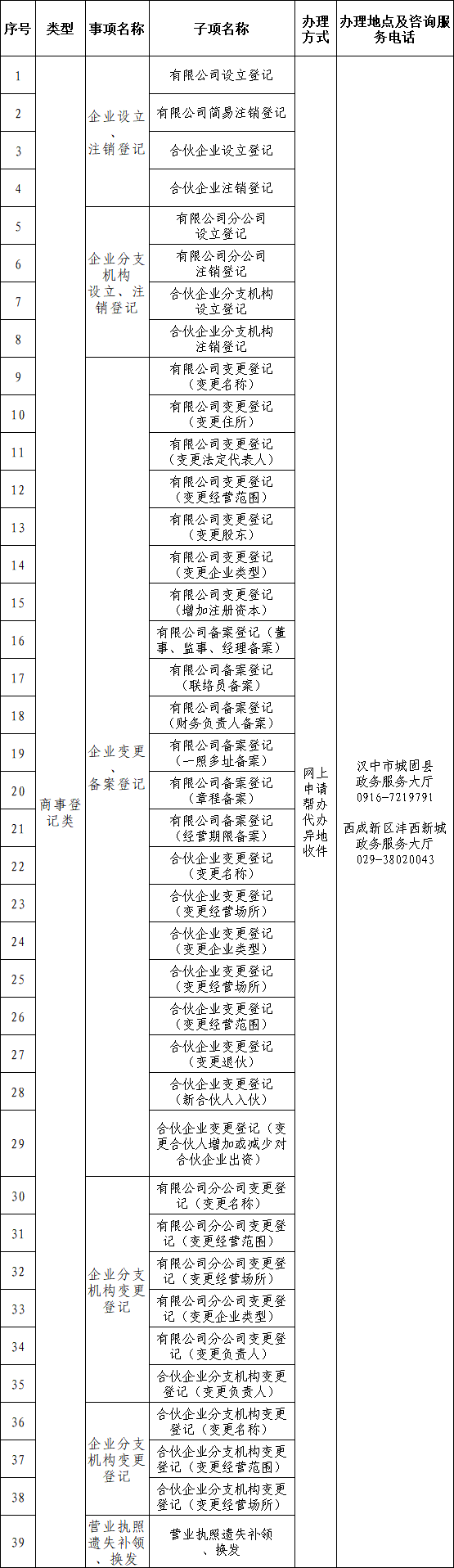 汉中市城固县与西咸新区沣西新城政务服务“跨区通办”事项清单(39项)