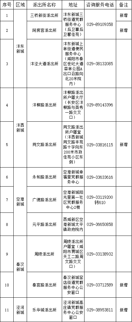 群众可在之前公布的永和路派出所、广德路派出所、元平路派出所、周陵派出所、沣泾大道派出所、沣柳路派出所6家派出所办理点办理公安综合业务外,还可前往本次新开通的三桥新街派出所、阿房宫派出所、同文路派出所、秦宫路派出所、乐华城派出所这5家新增办理地点办理公安综合业务,新增办理点于7月3日正式对外办公。