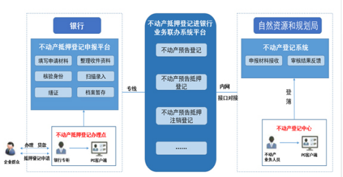 (四)统一办事流程。对业务流程进行梳理再造,统一办理流程。企业和群众在银行网点办理抵押贷款,一次性填写相关资料,委托银行办理抵押登记申请工作。受理银行根据不动产登记中心部署的业务平台完成资料收集和填报工作。登记机构对银行在系统中提交的相关资料进行审核,登簿后产生电子证照推送给银行,银行据此进行放贷。办理抵押注销登记时,由银行等金融机构在业务平台提出申请,登记部门即时办结。